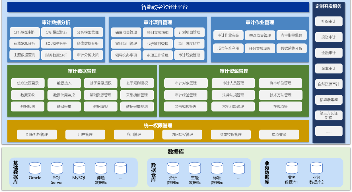 面向特派办、地市审计机关等,满足审计人员开展日常审计业务、数据综合分析的综合性辅助平台,具备审计计划、审计项目、审计对象、审计线索、审计成果、审计知识等审计业务全流程管理功能,以及数据资源管理、数据授权管理、在线SQL分析、分析模型制作、风险监控预警等数据管理分析功能。